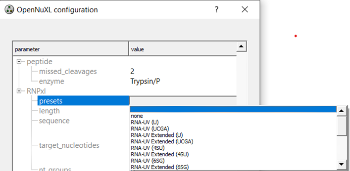 noneinPresets. You can then defineFragment adductsandModificationsin advanced parameters according to your protocol in the following format:[target nucleotide]:[formula]or[precursor adduct] ->[fragment adduct formula];[name]. NuXL will use this information to generate all chemically feasible precursor adduct and fragment adduct combinations. Cross-link identification->Can cross-link: If you expect only a single or subset of nucleotides to be amenable to crosslinking, set this up here. Nucleotides are specified by their one-letter code without a separator (e.g. UA for U and A nucleotides)Cross-link identification->Cysteine adduct: If DTT is present during UV irradiation, it can generate additional crosslinks including a 152 Da linker. For more information see 1. If needed to be identified, we recommend specifying the composition of the linker in modifications and ‘Fragment adducts’ instead. Set this flag to true, if the 152 adduct is expected.Cross-links->Target nucleotides: Sum formulas of the target nucleotides of the crosslink. Heavy labeled atoms are specified with parenthesis in front with the nominal mass of the respective isotope (e.g. (13)C, (15)N).